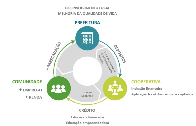 Quando os recursos do município são aplicados em banco, não há garantia de que irão circular na própria comunidade, pois irão compor o funding – volume de recursos destinos a operações de crédito – da instituição e poderão gerar empréstimos em outras regiões. Isso não ocorre com as cooperativas de crédito, que atuam localmente e garantem a aplicação do recurso nas próprias comunidades.