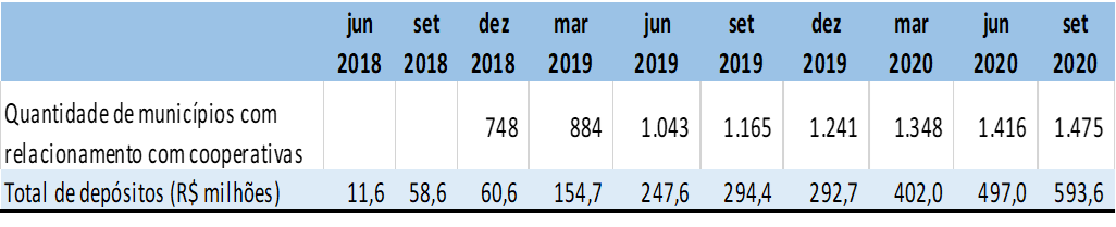 Em relação ao saldo de depósitos na data-base de set/2020, dos R$ 593,6 milhões, R$ 142,5 milhões de depósitos eram de municípios mineiros em cooperativas mineiras.